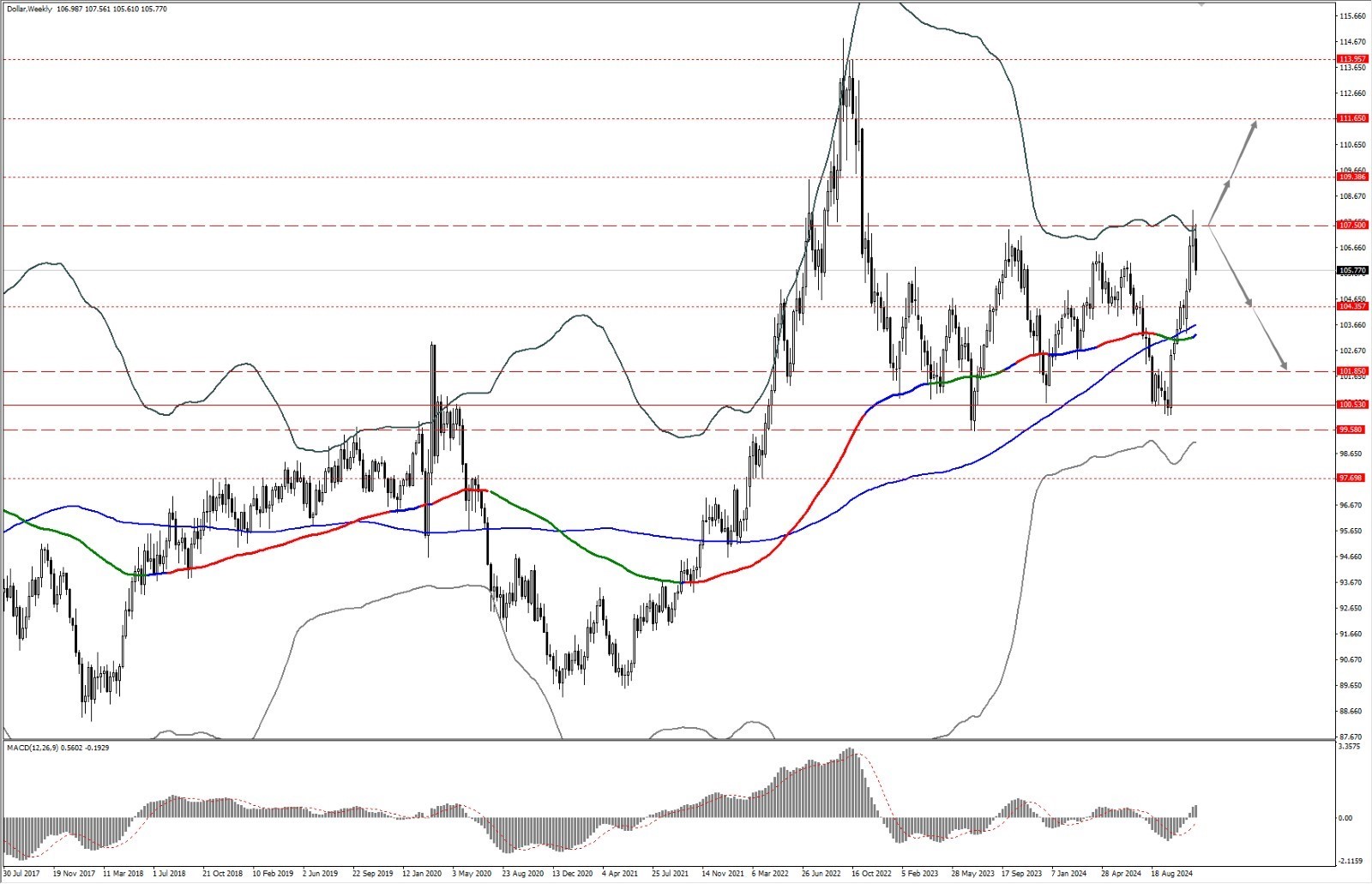 - 如果美指运行于 107.50 一线下方,则依次关注 104.35 和 101.85 两个位置的支撑力度;