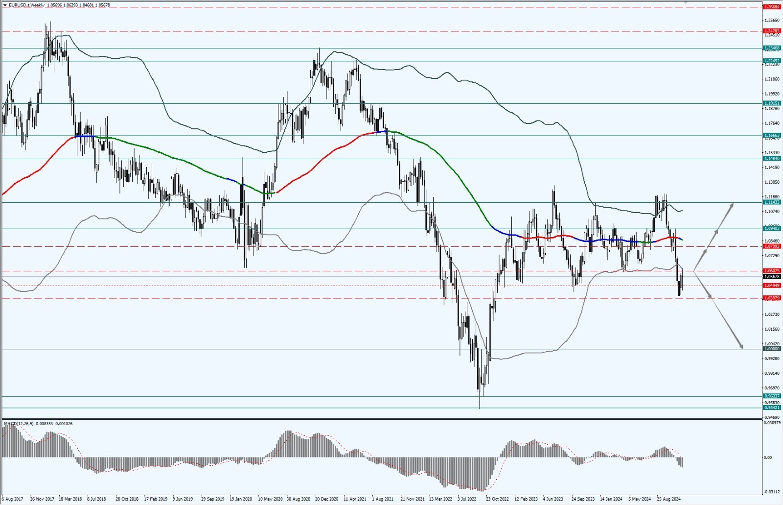 - 上周欧元在底部 1.0397 到 1.0607 区间横盘震荡,多方积极抵抗,但整体依旧处于空方主控区;
