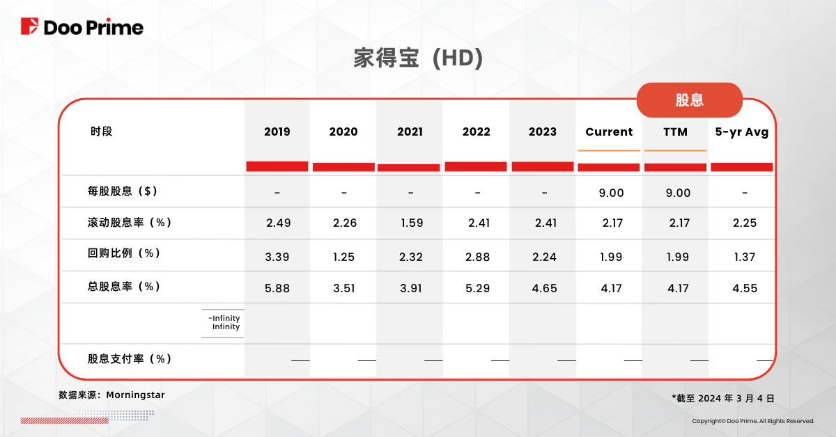 目前,家得宝的股息收益率(dividend yield)约为 2.21%,略低于 2023 年的 2.41%。每股股息(dividend per share)为 9 美元。虽然股息率小幅波动,但从历史纪录来看,整体相当稳定,表明它将保持增长。