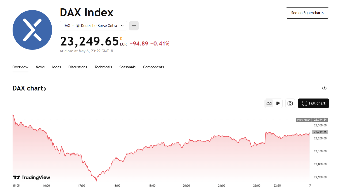 受此影响,当日德国法兰克福股市 DAX 指数大幅震荡下行,德国 DAX 30 指数收跌 0.41%,结束此前连续九个交易日上涨的趋势,报 23249.65 点。