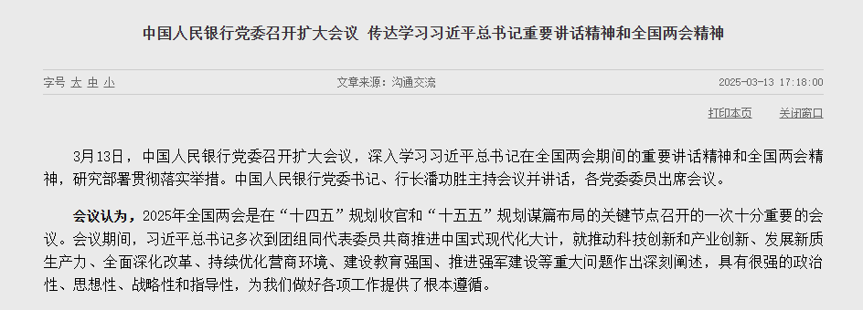 中国人民银行党委召开扩大会议,中国人民银行党委书记、行长潘功胜主持会议并讲话,表示中国人民银行要认真贯彻习近平总书记重要讲话精神和政府工作报告部署,注重目标引领,把握政策取向,讲求时机力度,强化系统思维,为推动经济持续回升向好营造良好的货币金融环境。