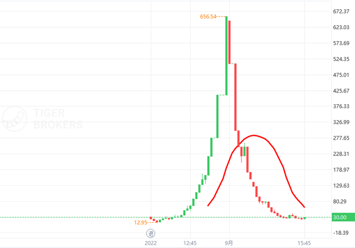 随后的几个交易日,该股持续下跌,截至 9 月 1 日收盘已回落至 5.5 美元/股,较上市首日 186.01 美元的最高价,已下跌 97%。