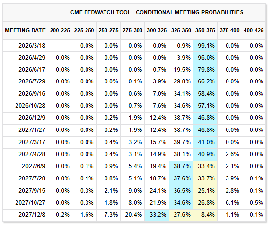 根据芝加哥商品交易所(CME)FedWatch 工具数据显示,在冲突爆发之前,市场普遍预期美联储 6 月将降息 25 个基点,9 月可能再度降息,甚至有小概率全年降息三次。然而近期价格走势显示,投资者已明显下调对宽松政策的押注,有关“更高利率维持更久”的预期再度回升。