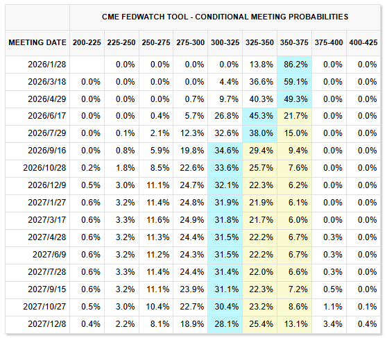 根据芝商所 FedWatch 工具,目前市场预期美联储 2026 年将有两次降息,首次降息可能落在 4 月,降息概率约为 57.2%。