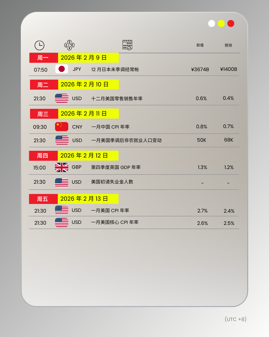 财经日历 | 以下为 2026 年 2 月 9 日至 2026 年 2 月 13 日(GMT+8 北京时间) 全球重大经济事件提醒。在重大行情期间,请确保您已审查您的保证金率,并有足够的保证金来支撑您的风险敞口。