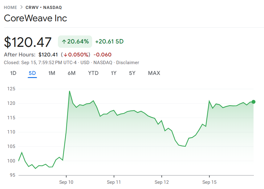 受此提振,CoreWeave 股价盘中一度大涨近 8%,尾盘涨幅收窄至 5.09%,报 117.66 美元。这笔交易不仅进一步巩固其作为英伟达核心云端合作伙伴的地位,也为公司提供一层“保底”保障,以应对 AI 运算需求可能放缓的风险。