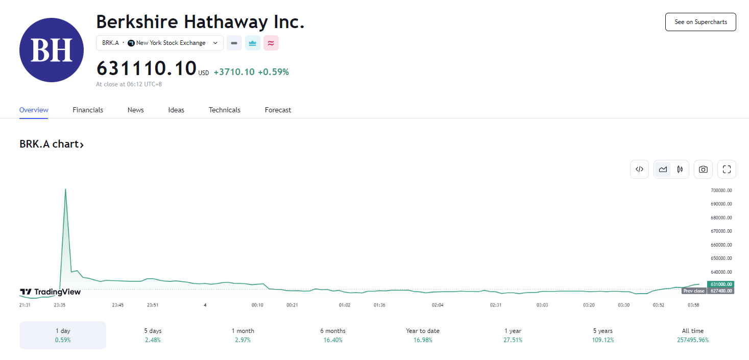 然而,此事件并未对主要市场指数产生显著影响。故障修复后,伯克希尔 A 类股收于 631110 美元,当日上涨 0.6%。