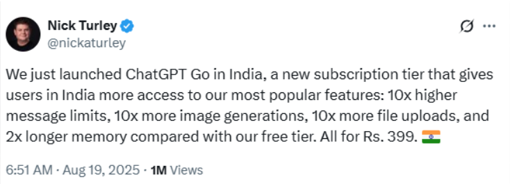 OpenAI 推出了史上最便宜的 ChatGPT 订阅方案“ChatGPT Go”,该服务率先在印度上线,月费仅为 399 卢比(约 4.6 美元)。用户即可使用最新的 GPT-5 模型,享受图像生成功能和扩展的记忆容量,消息数量为免费版的十倍。此举旨在拓展全球第二大智能应用市场印度。