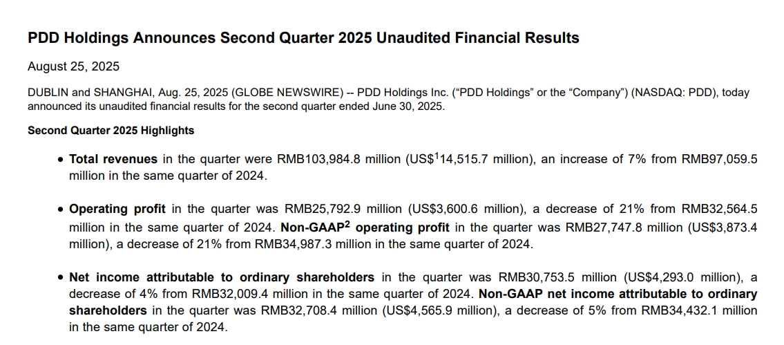 拼多多集团执行董事、联席 CEO 赵佳臻在财报电话会上表示,二季度的一系列投入必然带来营收增速放缓和利润下降,未来还将持续加大投入。“因此,我们不认为本季度的利润具有持续性,后续波动仍将较大。”