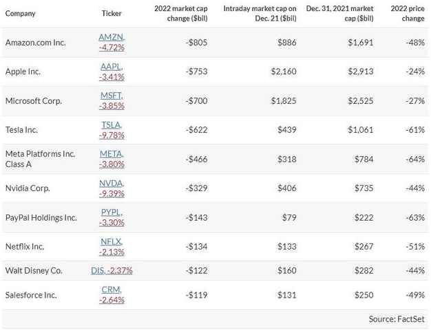 然而,特斯拉并不是个例。2022 年,亚马逊市值蒸发约 9000 亿美元,苹果蒸发近 8900 亿美元,谷歌蒸发逾 8400 亿美元,微软蒸发超 7800 亿美元,Meta 蒸发超 7600 亿 美元,都超过特斯拉市值蒸发规模。