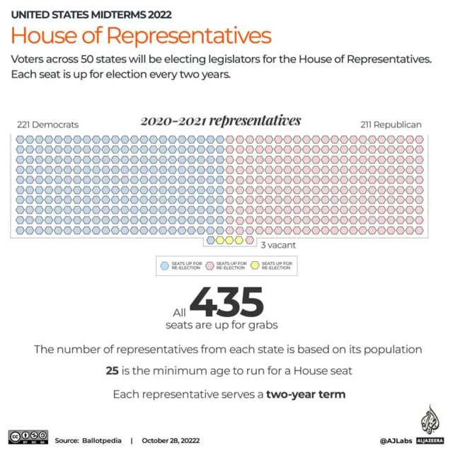 根据美国宪法,美国每两年举行一次国会选举,其中一次与四年一度的总统大选同时进行,另一次则在总统任期内举行。这次的中期选举为后者,届时众议院的全部 435 席、参议院 100 席中的 35 席,以及美国 50 个州的 36 个州长职位均将进行改选。国会参众两院的改选向来是中期选举的重头戏,也是共和党与民主党展开争夺的主要战场。共和党目前拥有 50 个席位,民主党拥有 48 个席位,另外两名独立人士与民主党共组,参议院领袖和民主党副总统哈里斯可在任何 50 票对 50 票的平局中投下决定性一票。