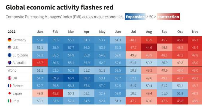 2019 年 12 月至 2022 年 11 月全球央行的政策利率变动的情况: