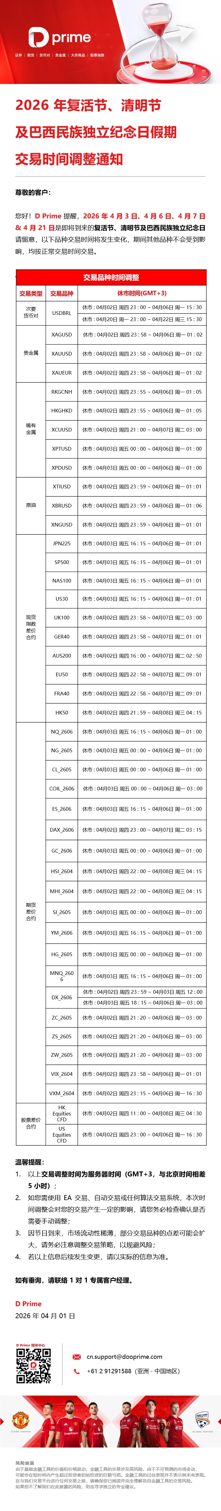 2026 年复活节、清明节及巴西民族独立纪念日假期品种交易时间调整通知