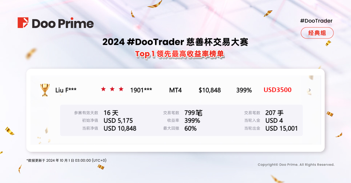2024 #DooTrader 慈善杯 9 月大赛报名时间接近尾声,在 2024 年 10 月 7 日 23:59(UTC+0)前登录 Doo Prime,即可通过 1,000 美元的超低门槛参赛!诚邀您加入这场顶尖交易盛宴,展示您的交易实力,角逐丰厚奖金! >>>>>>立即点击报名参加!