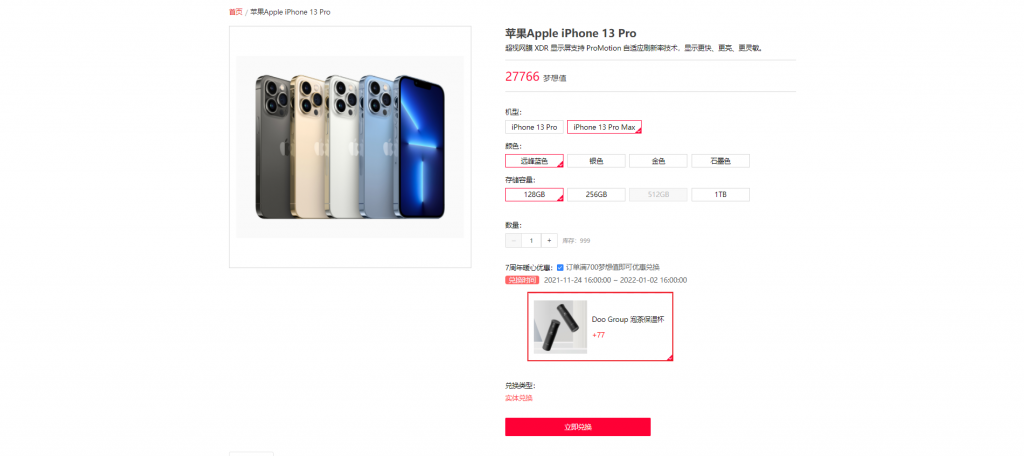 - 选择礼品规格及数量(单一订单必须满 700 梦想值),然后以77 梦想值的优惠价 ,兑换“Doo Group 限量版泡茶保温杯”