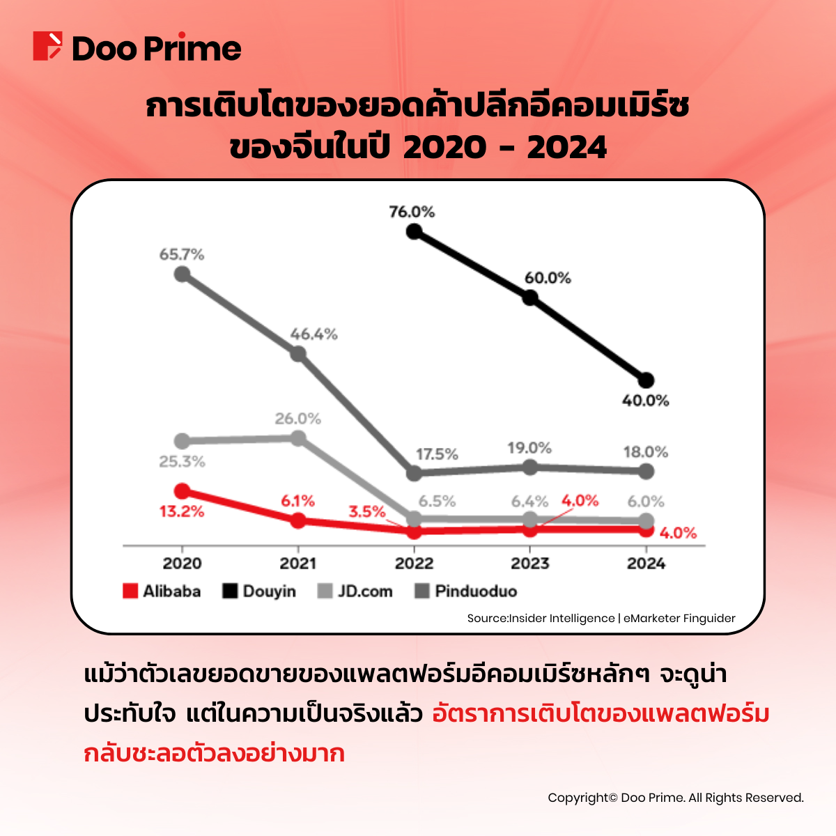 อย่างไรก็ตาม เมื่อคุณพิจารณาอัตราการเติบโตของ GMV เมื่อเทียบเป็นรายปีในไตรมาสที่สาม กลุ่ม Taobao เพิ่มขึ้นเกือบ 3%, JD.com เพิ่มขึ้น 11%, Pinduoduo เพิ่มขึ้น 22% และ Douyin เพิ่มขึ้น 43% สิ่งนี้เน้นให้เห็นถึงการเปลี่ยนแปลงจากอีคอมเมิร์ซแบบ Shelf-basedไปสู่อีคอมเมิร์ซที่ขับเคลื่อนด้วยเนื้อหา