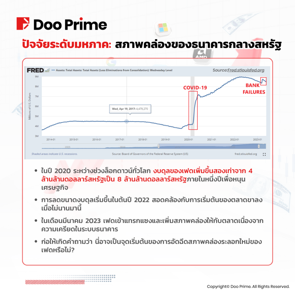 ในเดือนมีนาคม 2023 จากความเครียดในระบบธนาคาร เฟดจึงจำเป็นต้องเข้าแทรกแซงและจัดหาสภาพคล่องให้กับตลาด ก่อให้เกิดคำถามว่า นี่อาจเป็นจุดเริ่มต้นของการอัดฉีดสภาพคล่องระลอกใหม่ของเฟดหรือไม่?