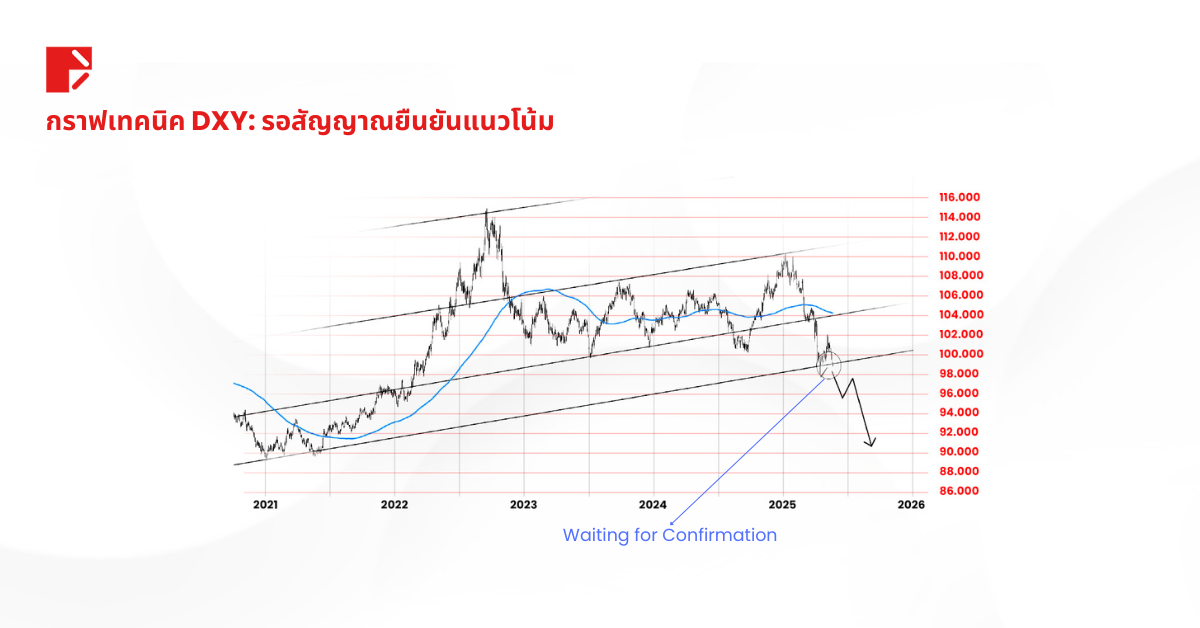 ดัชนีดอลลาร์ (DXY) ขณะนี้กำลังเคลื่อนไหวใกล้ระดับแนวรับระยะยาวสำคัญที่บริเวณ 98 ถึง 99 หากไม่สามารถยืนอยู่เหนือระดับนี้ได้ ก็อาจเป็นจุดเริ่มต้นของการร่วงลงต่อไปที่แนวรับบริเวณ 9