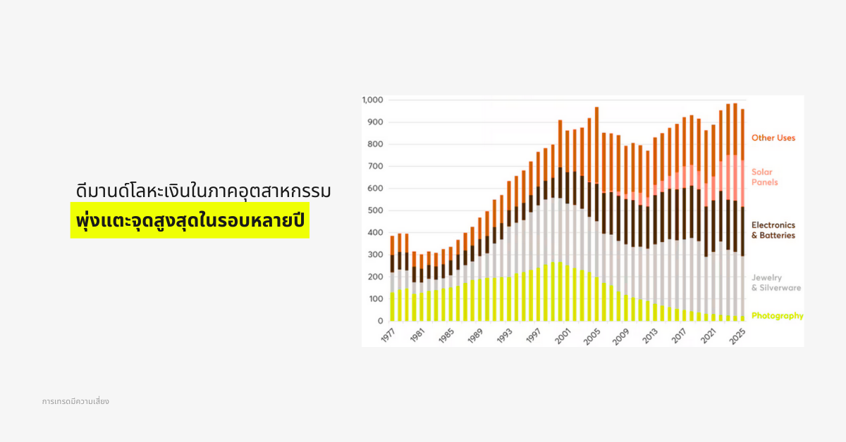 กล่าวอีกนัยหนึ่ง โลหะเงินมีความต้องการทั้งในแบบอุตสาหกรรมและสินทรัพย์ปลอดภัย ธรรมชาติแบบสองด้านนี้เป็นส่วนหนึ่งที่ทำให้ความผันผวนของราคาโลหะเงินสูงมาก เมื่อกิจกรรมทางอุตสาหกรรมและความต้องการเสี่ยงลดลงพร้อมกัน โลหะเงินอาจถูกเทขายอย่างหนัก แต่เมื่อทั้งสองปัจจัยฟื้นตัวพร้อมกัน ขาขึ้นก็อาจรุนแรงได้เช่นกัน ดังที่ปี 2025 ได้แสดงให้เห็นแล้ว