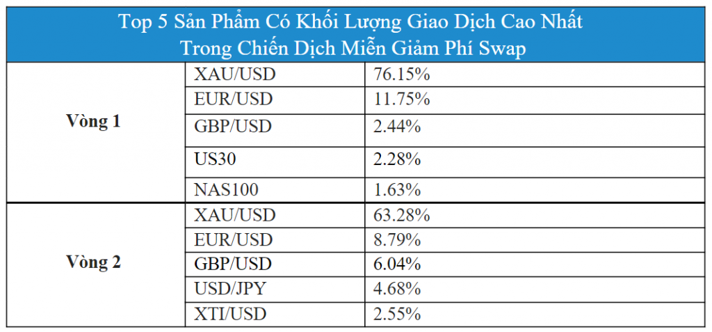 So với vòng trước đó của chiến dịch Miễn Giảm Phí Swap, các sản phẩm được giao dịch nhiều nhất trong chiến dịch lần này là cặp XAU/USD, EUR/USD, GBP/USD, USD/JPY, tiếp đến là cặp XTI/USD.